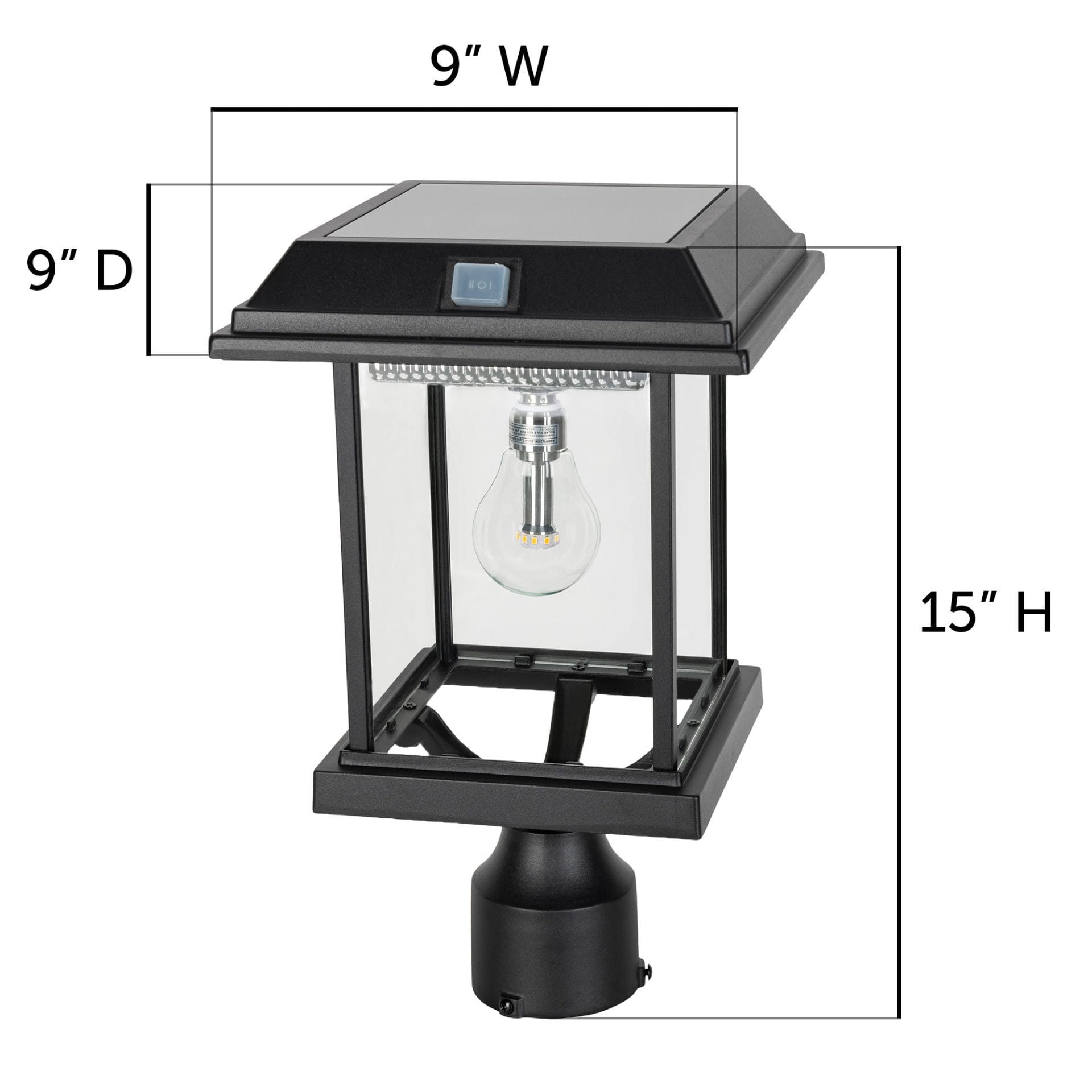 Crafted from weather-resistant, powder-coated cast aluminum in a timeless black finish, this lantern-style solar light features a clean-lined, squared frame and crystal-clear glass panes, bringing a touch of modern sophistication to your outdoor space. At the heart of this fixture is Gama Sonic’s patented GS Solar LED Bulb, producing a full 360° glow at 250 lumens of warm white (2700K) light, designed to replicate the classic look of incandescent bulbs with clean, solar-powered efficiency. The integrated HIGH/LOW/OFF switch gives you full control over choosing maximum brightness, extended runtime ambient glow or disabling it when not needed.