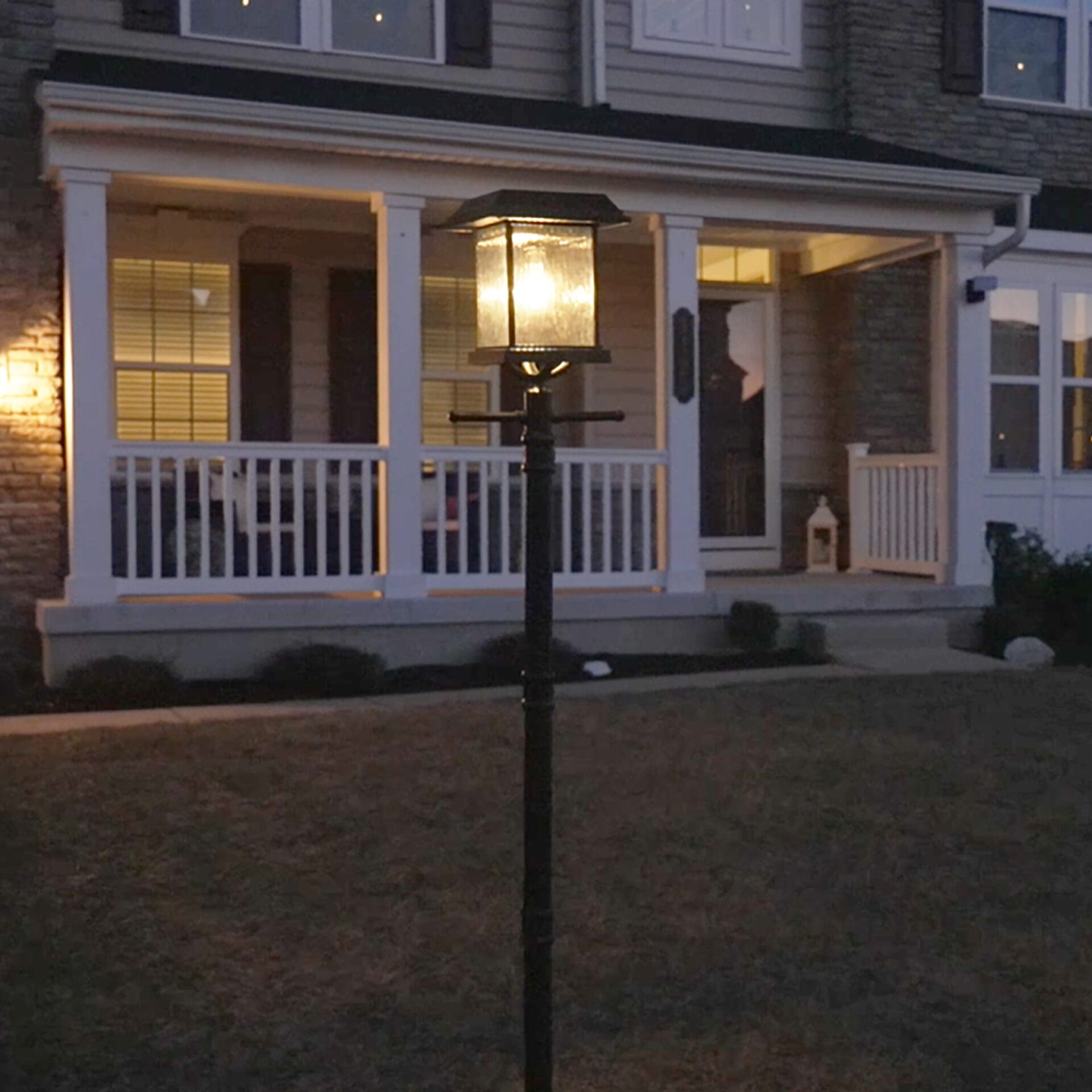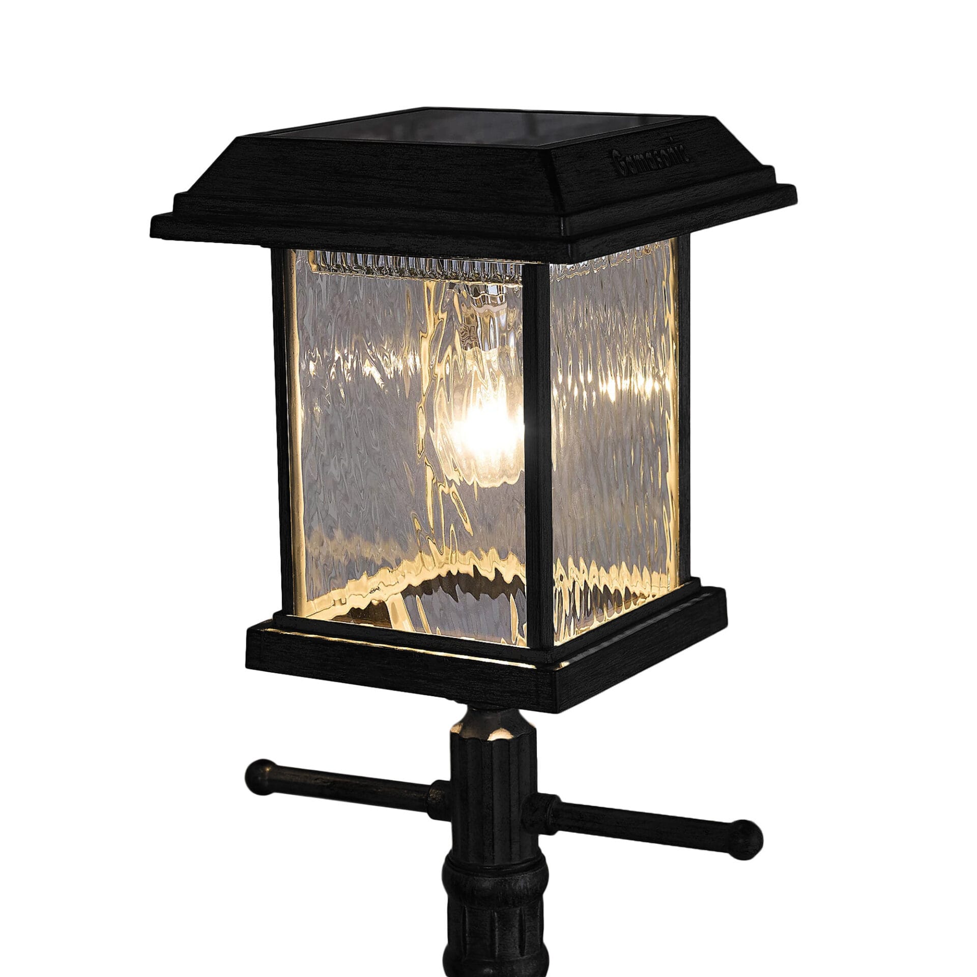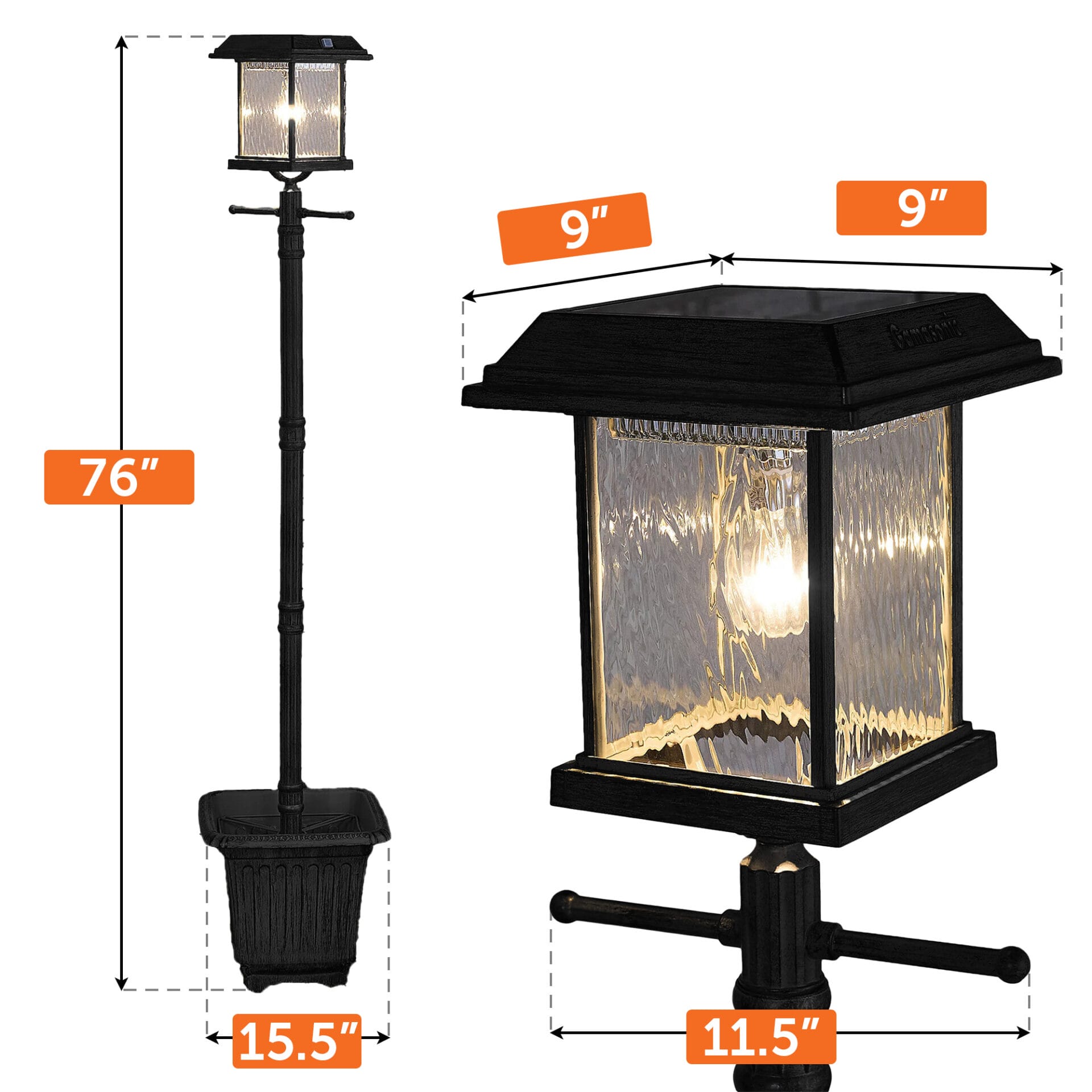 The Aspen Solar Lamp Post with Planter & EZ Anchor delivers stylish, reliable outdoor lighting with a versatile design that installs easily in any area of your home. Standing 78 inches tall and available in Black or Weathered Bronze, this solar lamp post can be used with its decorative planter base to frame entryways, patios, decks, or driveways, or converted into a traditional post lamp by removing the planter and securing it into the ground with the included EZ Anchor. This adaptable setup makes it an ideal solar lighting solution for homeowners seeking a simple, no-wiring DIY upgrade. The lamp includes two patented LED bulbs—a warm white bulb for everyday brightness and a flickering flame effect bulb for creating a cozy, decorative ambiance—allowing you to set the perfect mood for any outdoor area. Powered entirely by the sun, the Aspen operates automatically from dusk to dawn, providing worry-free illumination without electricity or maintenance. Crafted from durable cast aluminum with clear rain glass panels that diffuse light softly, this lamp post is built to withstand the elements with IP65 weather resistance, ensuring long-lasting performance in rain, snow, or heat. With its blend of solar efficiency, elegant styling, and installation flexibility, the Aspen Solar Lamp Post enhances any yard, garden, walkway, or entrance with dependable, decorative lighting.
