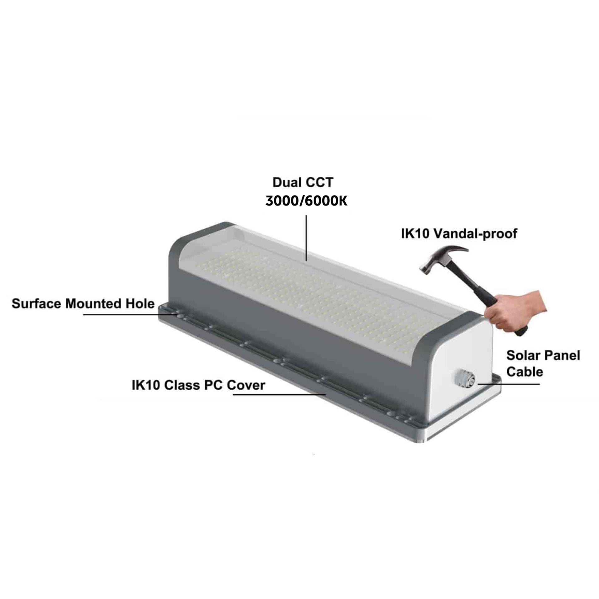 This solar light comes with dual color temperature options, offering both warm white (3000K) and bright white (6000K) settings, so you can create the perfect lighting ambiance for any environment. Crafted for commercial outdoor lighting applications, this light is designed with a weather-resistant cast aluminum body and a sleek silver finish, making it both durable and stylish. With an IP65 rating, the light is engineered to withstand tough weather conditions, while the IK10 Glass PC cover provides additional impact resistance, making it ideal for high-traffic areas and outdoor environments. With maintenance-free operation and a 5-year warranty, the Commercial Solar Shelter Light is designed to provide long-lasting, reliable performance. Whether you’re illuminating a bus stop shelter, shed, or any other covered commercial outdoor space, this solar-powered light is an eco-friendly, efficient solution for all your lighting needs.