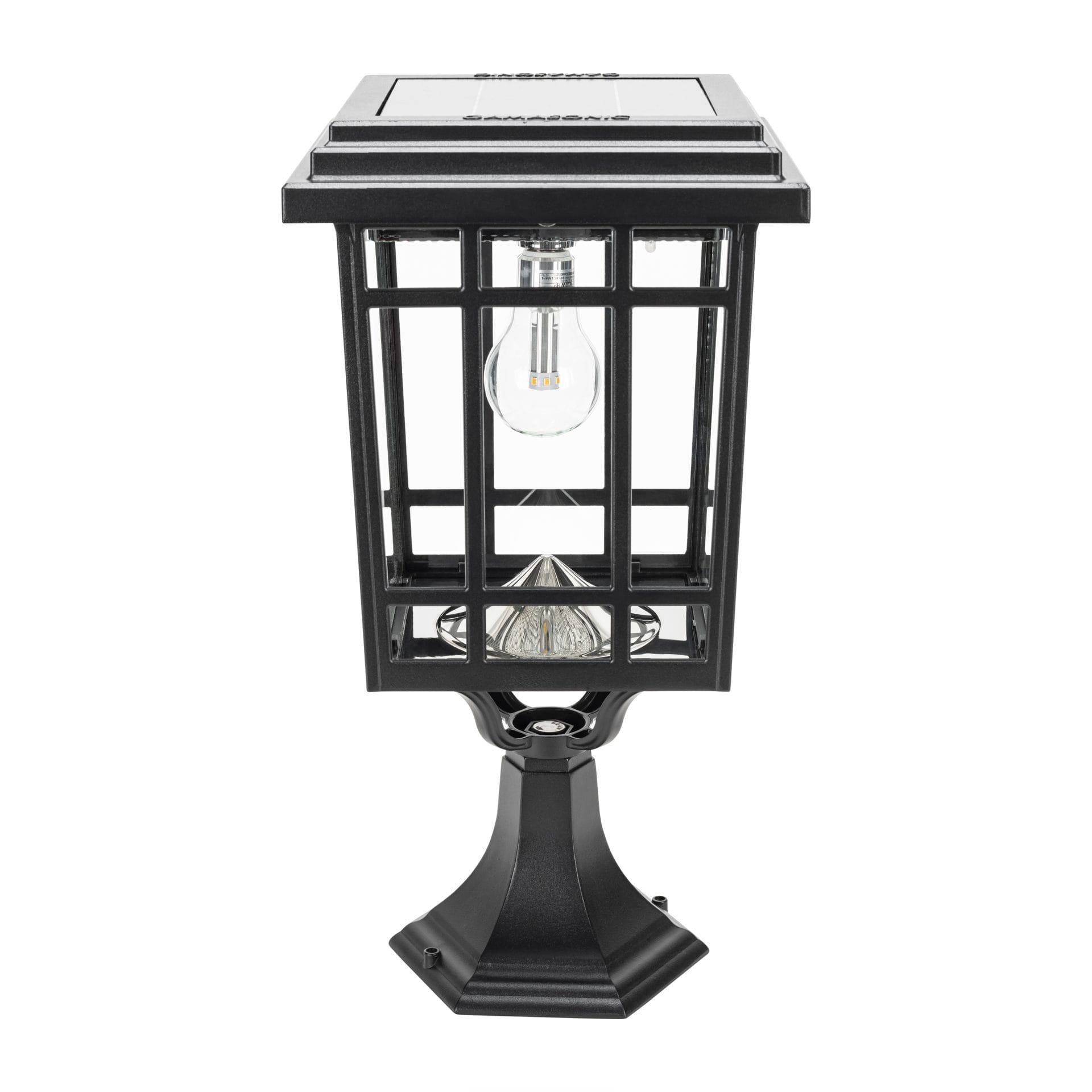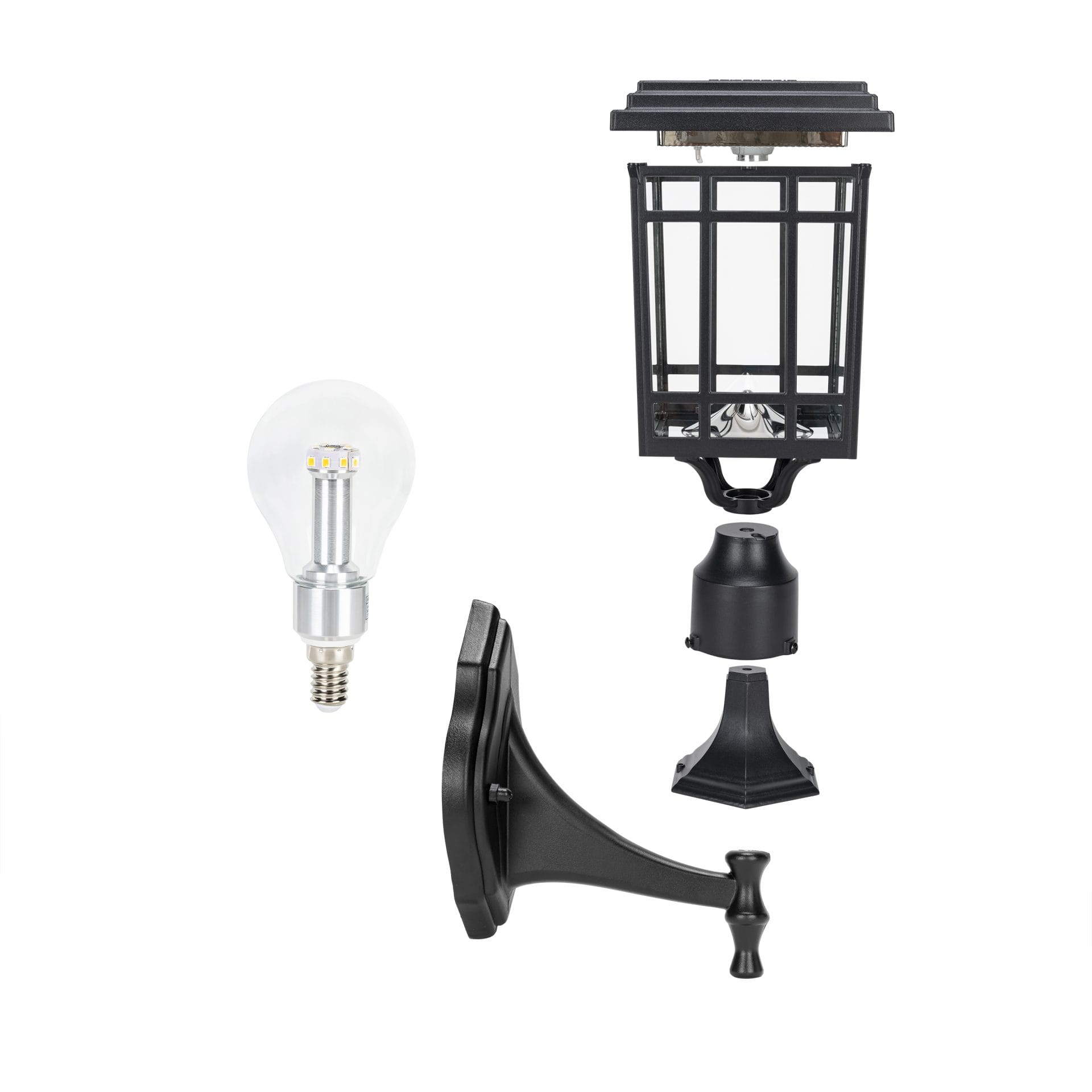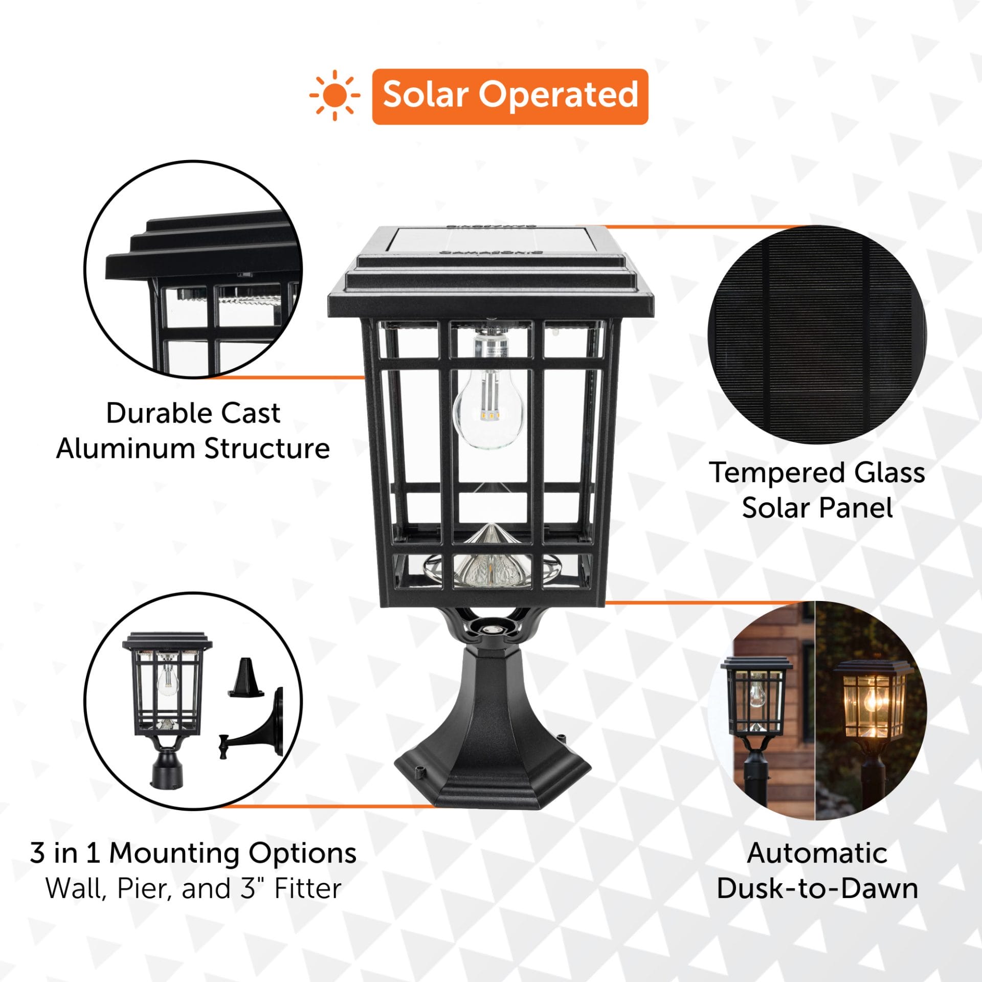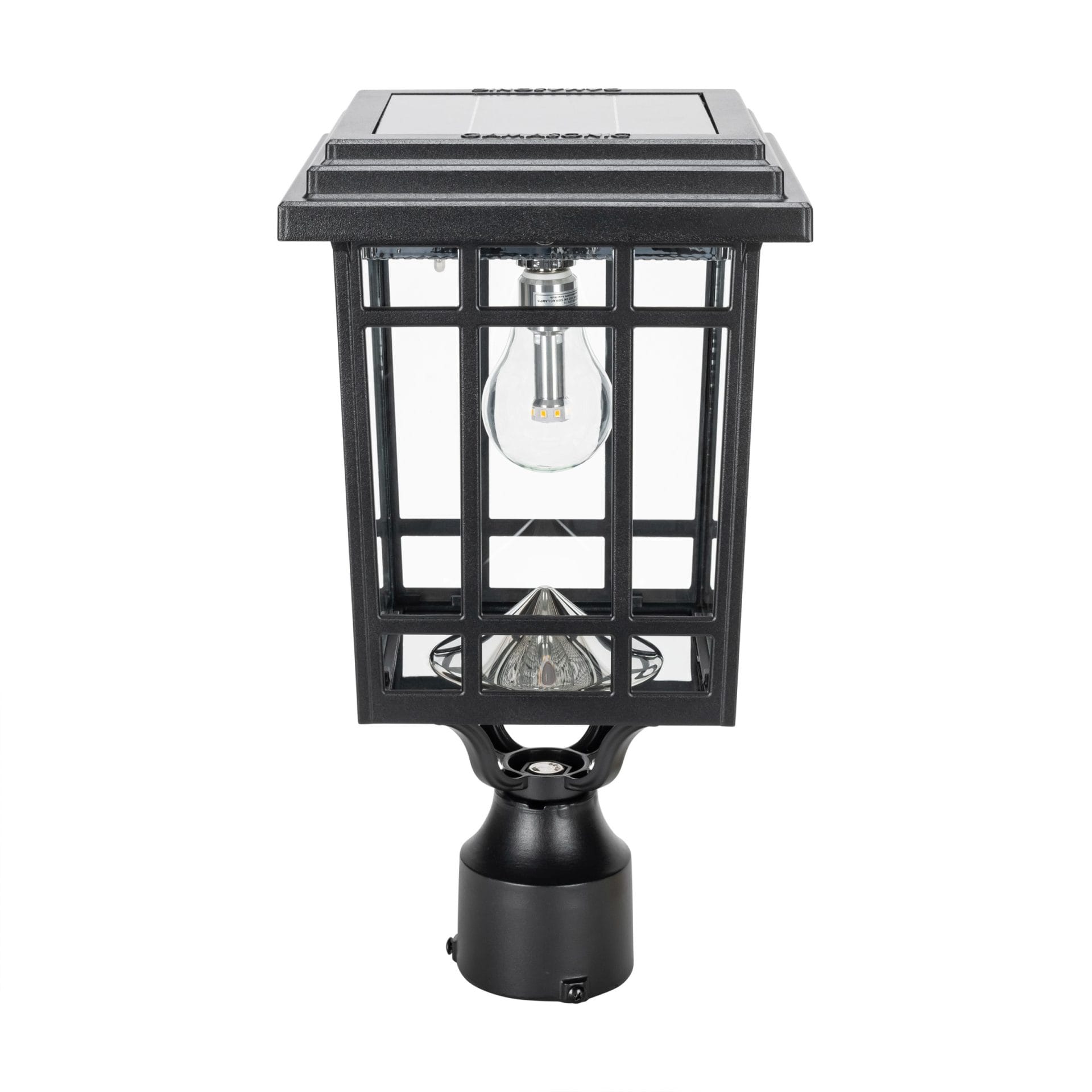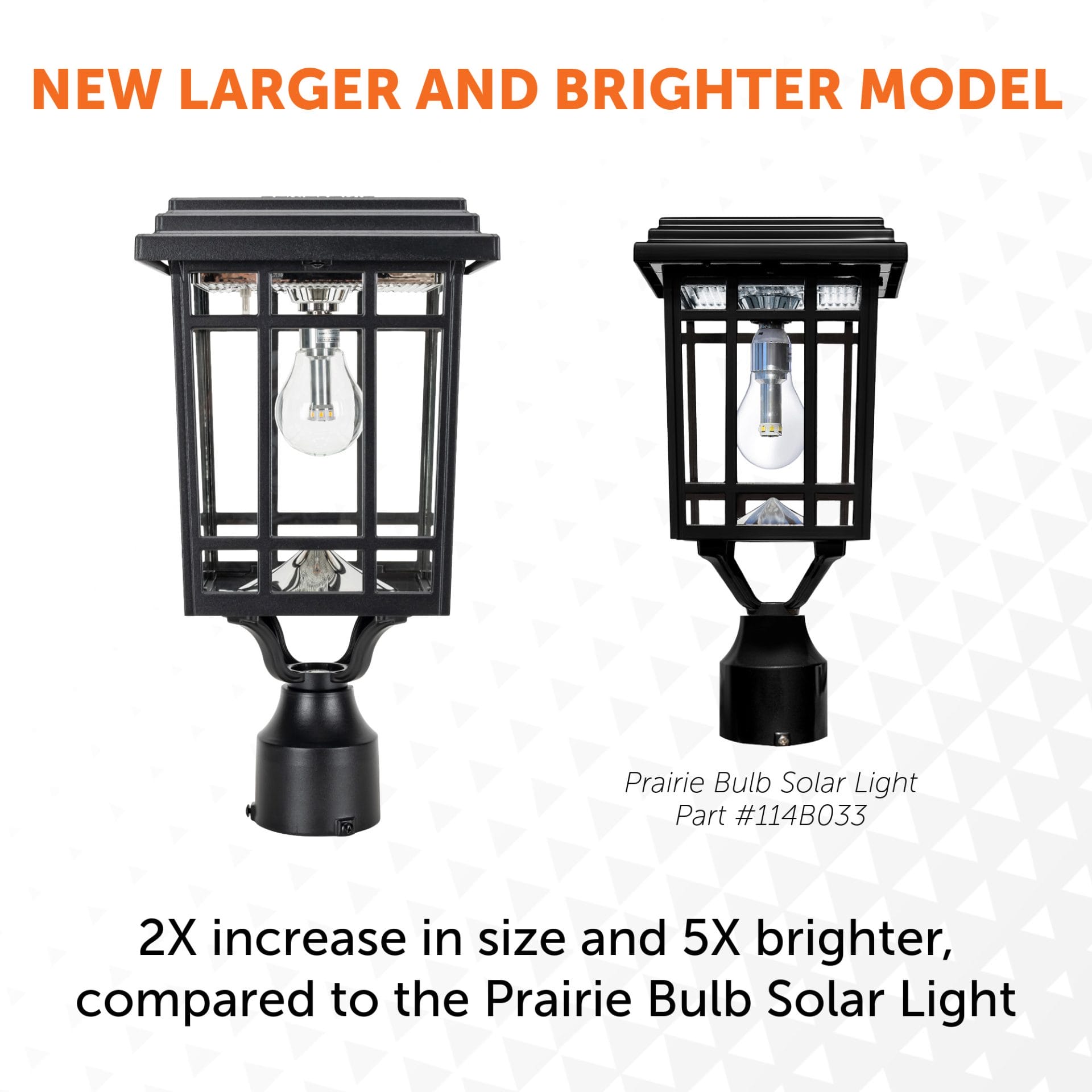 Make a bold, modern lighting statement with the new and improved Grand Prairie Bulb Solar Light, now delivering 66% more brightness. This re-engineered fixture fuses contemporary design with timeless craftsman style, adding a sophisticated glow that elevates any landscape or architectural setting, to your garage doors, on brick columns, lining your garden fence, or mounted on a classic lamp post. Finished in weather-resistant, powder-coated black cast aluminum, the lamp’s craftsman-style frame features clean grid lines and a bold architectural silhouette. Inside, it houses our GS Solar LED Bulb, delivering 250 lumens of warm white light in a full 360° spread, reminiscent of traditional incandescent bulbs. Integrated with GS Cone Technology, the built-in cone reflector intensifies brightness by evenly dispersing light, expanding coverage, and enhancing overall radiance, giving your outdoor space a richer, more luminous ambiance with every charge. The three mounting flexibility allows for: