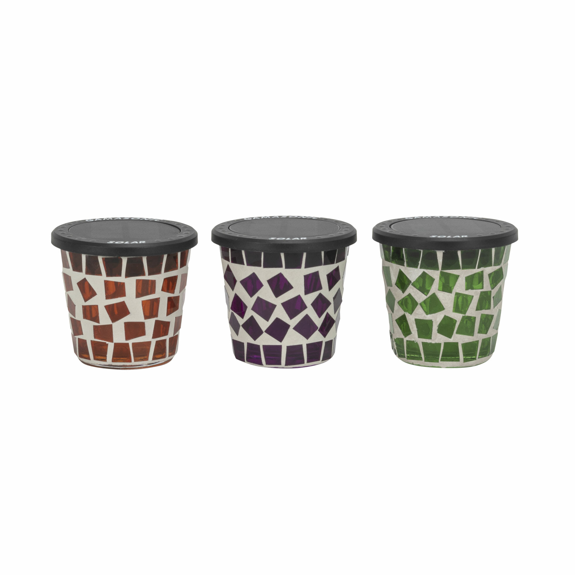 • Solar tea candles comes in three different mosaic colors in one box: green, orange and purple