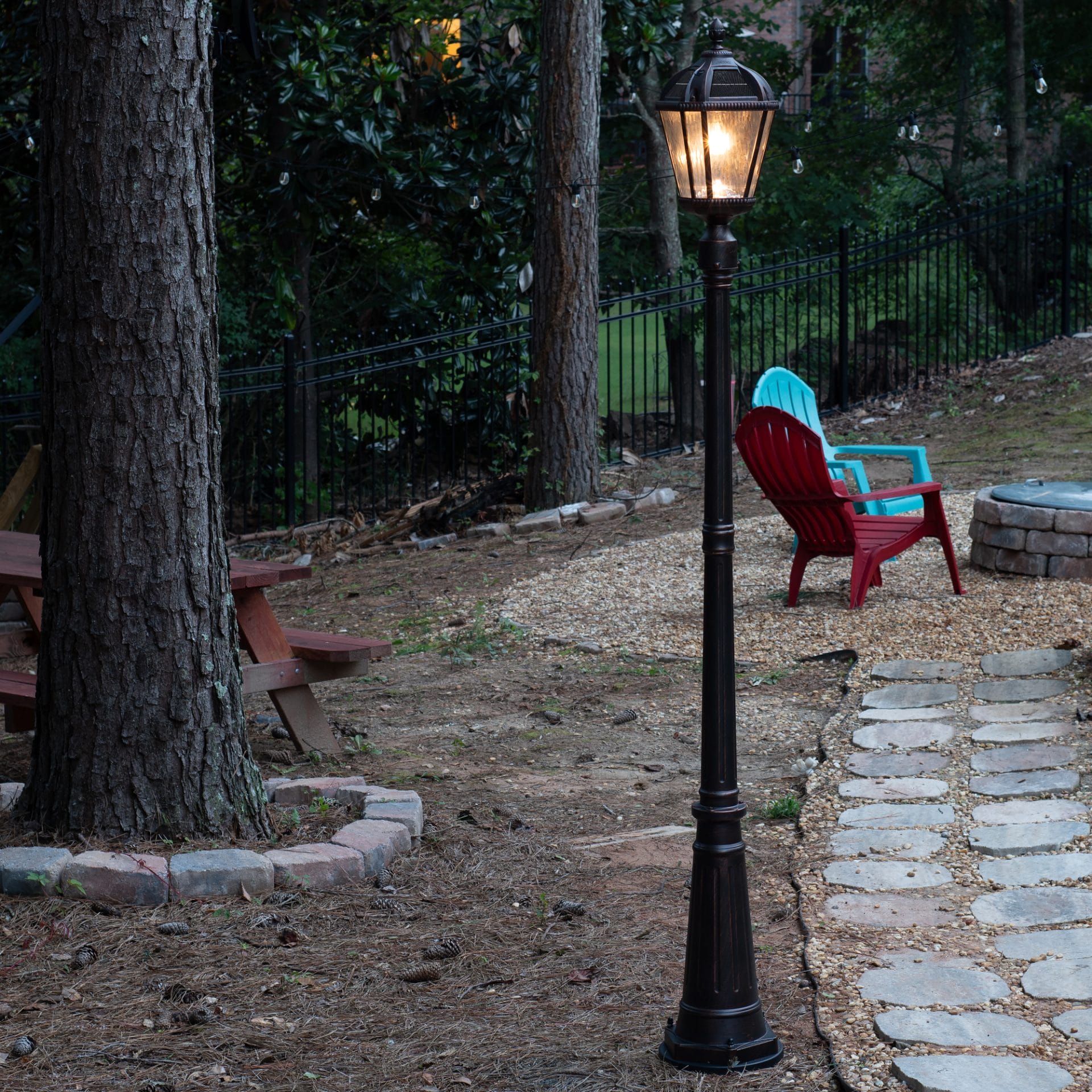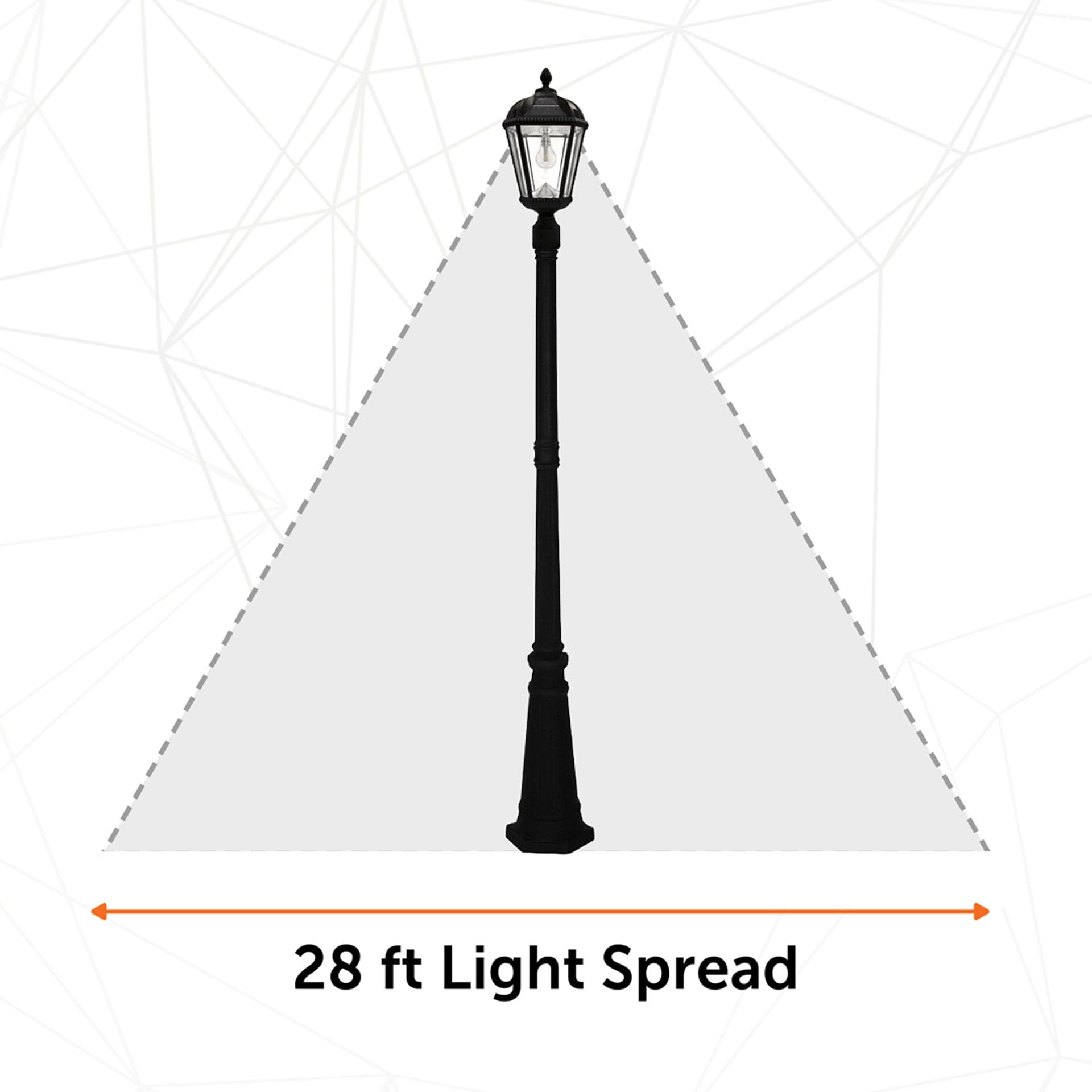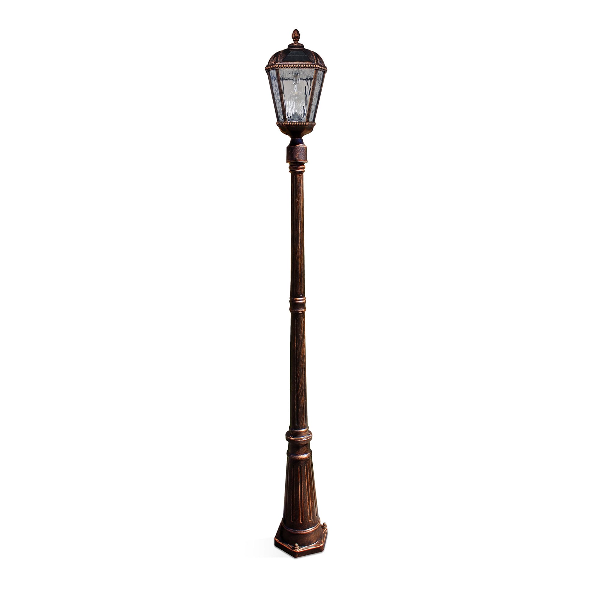 The Gama Sonic Royal Bulb is a single head solar lamp post that features an attractive design inspired by New Orleans architecture. Installation takes minutes and comes with all necessary hardware needed for mounting this unit. Stylish and easy to install, this fixture is the perfect energy and money saving replacement for electric or gas-powered outdoor lighting. Standing 87-inches tall, the Royal Bulb lamp post is constructed of weather-resistant, rust resistant cast aluminum with a powder-coated weathered bronze finish and beveled glass panes. This outdoor solar lamp post incorporates our cutting-edge GS solar LED light bulb technology and provides 360-degree illumination. At dusk, the solar lamp automatically turns on and provides a brightness of 150 lumens in a warm white (2700K) color temperature for up to 2 nights on a full charge. No wiring is needed. Just place this solar light in a spot with ample direct sunshine and let the sun do the rest.