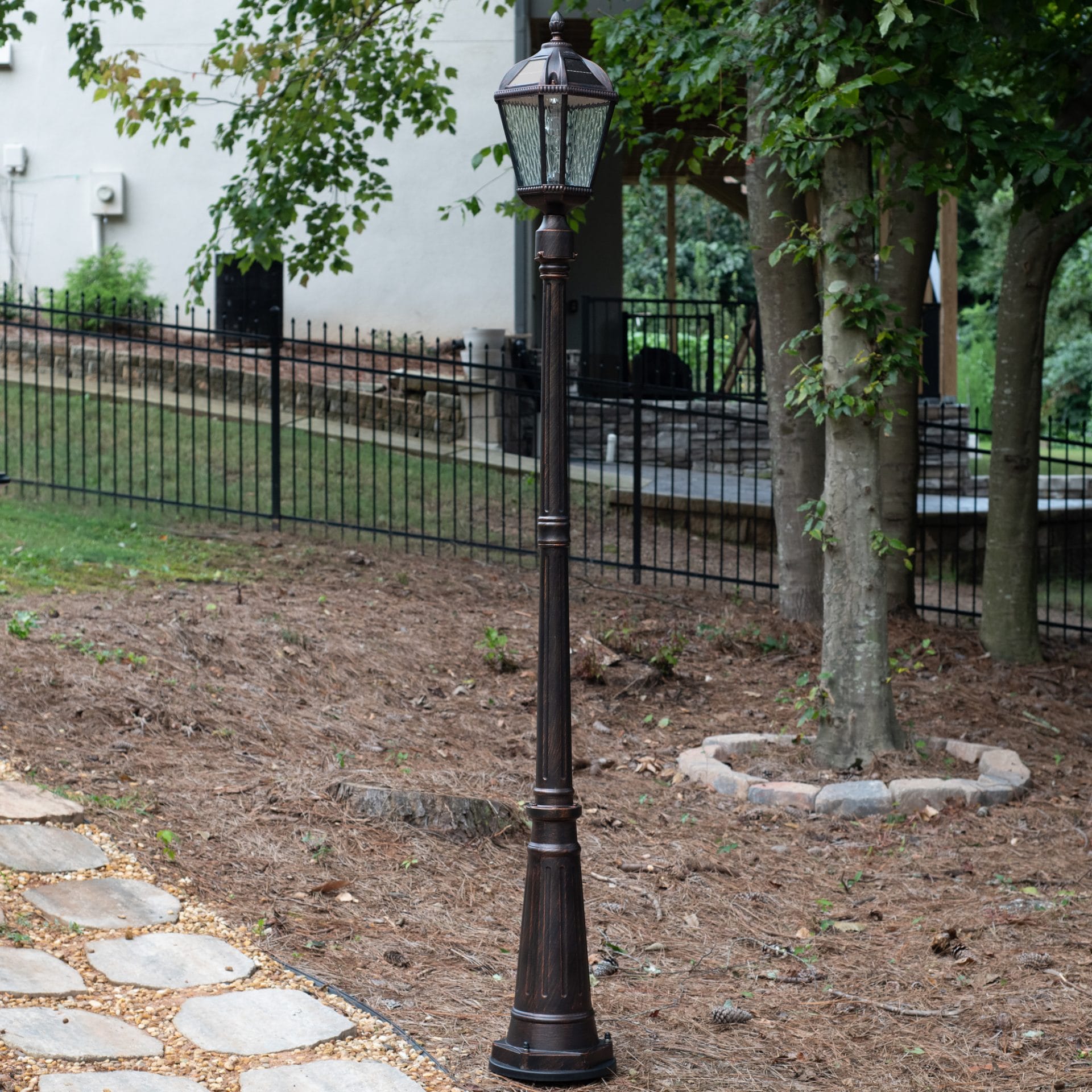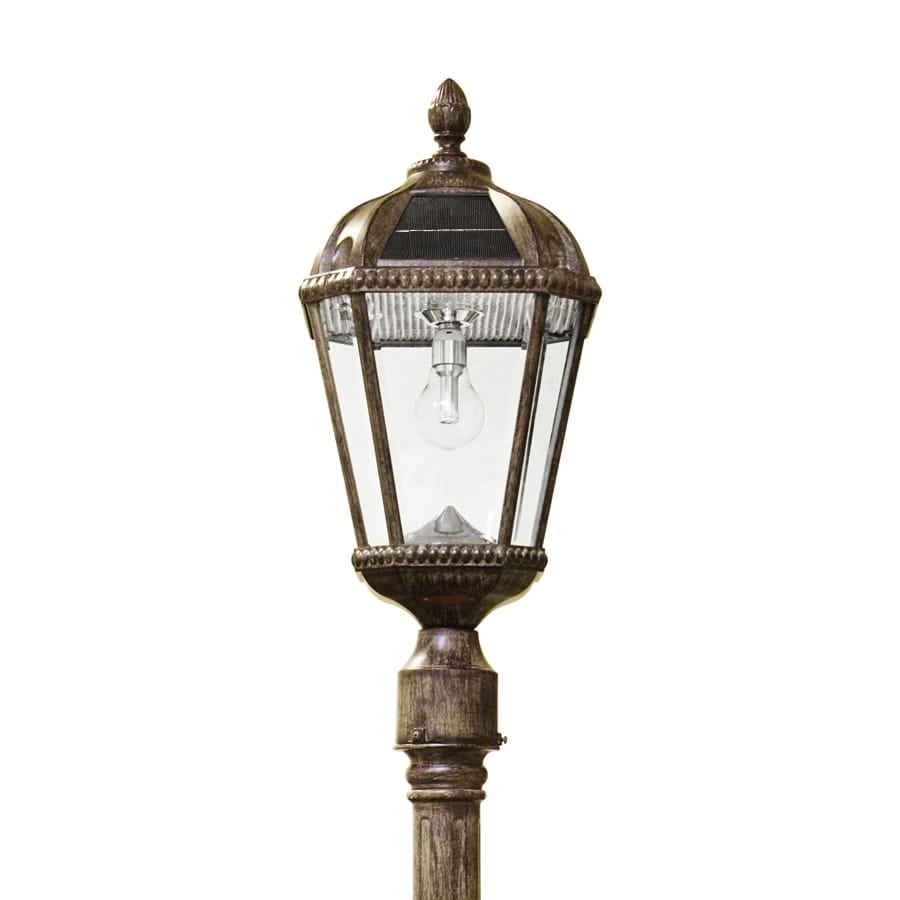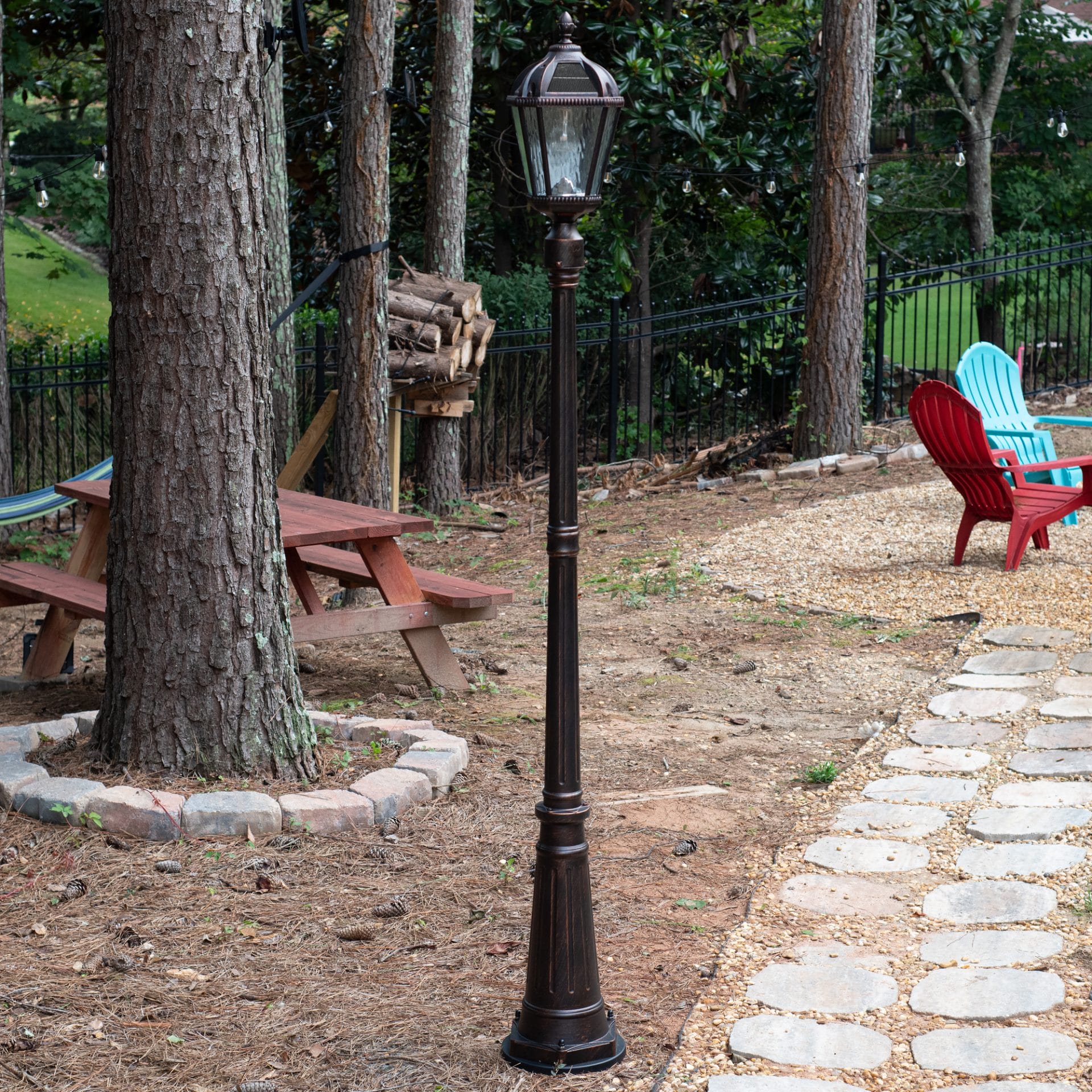 The Gama Sonic Royal Bulb is a single head solar lamp post that features an attractive design inspired by New Orleans architecture. Installation takes minutes and comes with all necessary hardware needed for mounting this unit. Stylish and easy to install, this fixture is the perfect energy and money saving replacement for electric or gas-powered outdoor lighting. Standing 87-inches tall, the Royal Bulb lamp post is constructed of weather-resistant, rust resistant cast aluminum with a powder-coated weathered bronze finish and beveled glass panes. This outdoor solar lamp post incorporates our cutting-edge GS solar LED light bulb technology and provides 360-degree illumination. At dusk, the solar lamp automatically turns on and provides a brightness of 150 lumens in a warm white (2700K) color temperature for up to 2 nights on a full charge. No wiring is needed. Just place this solar light in a spot with ample direct sunshine and let the sun do the rest.