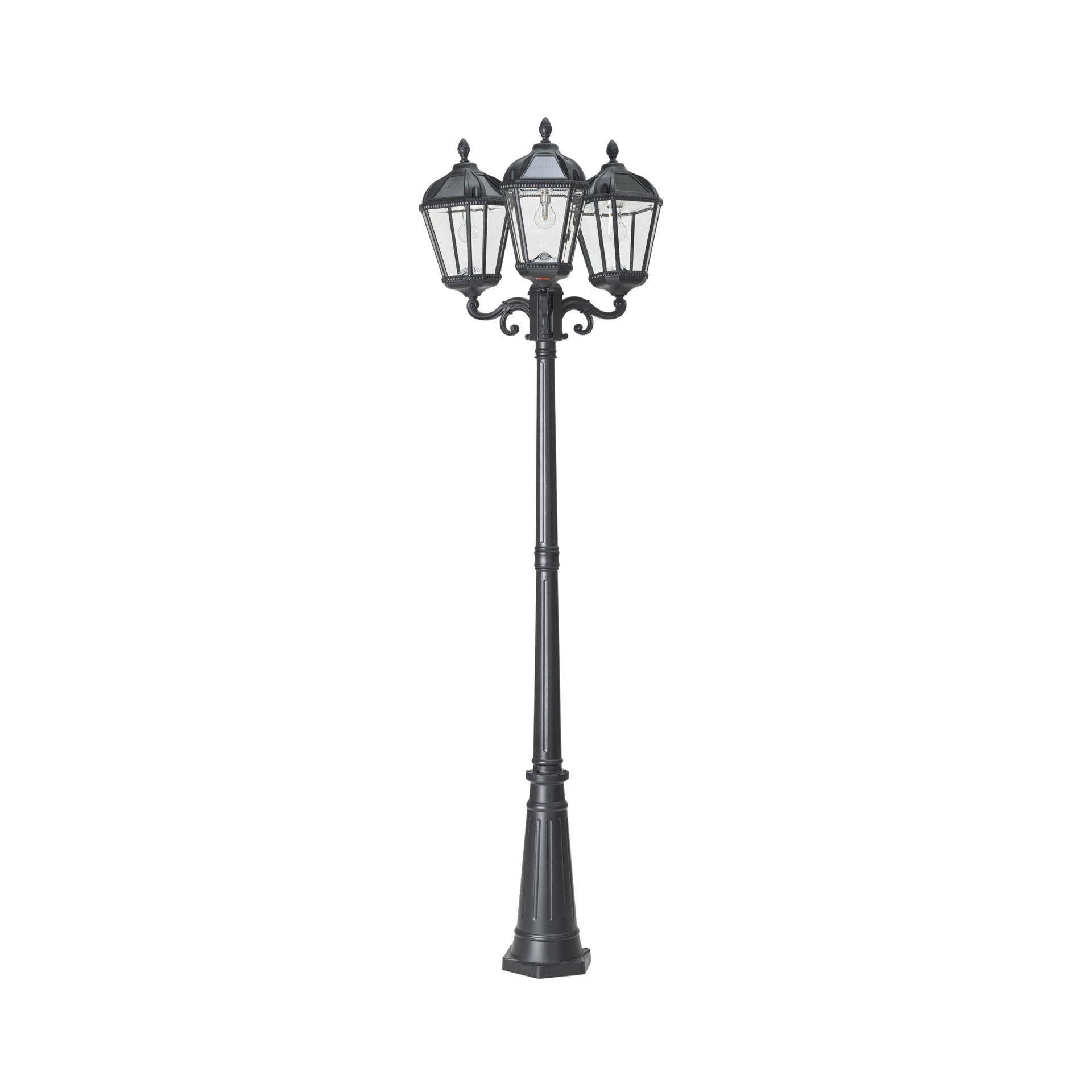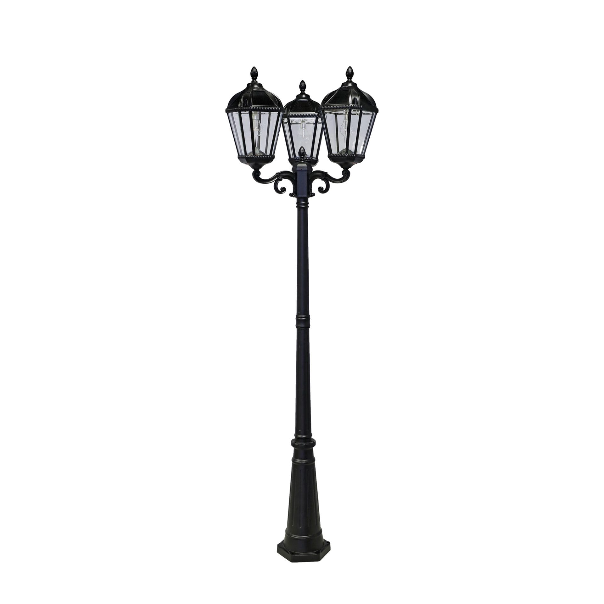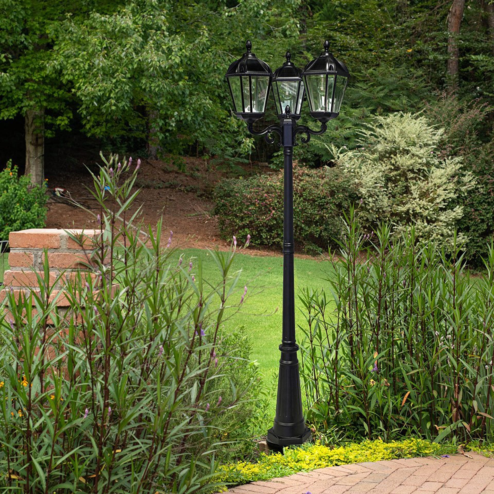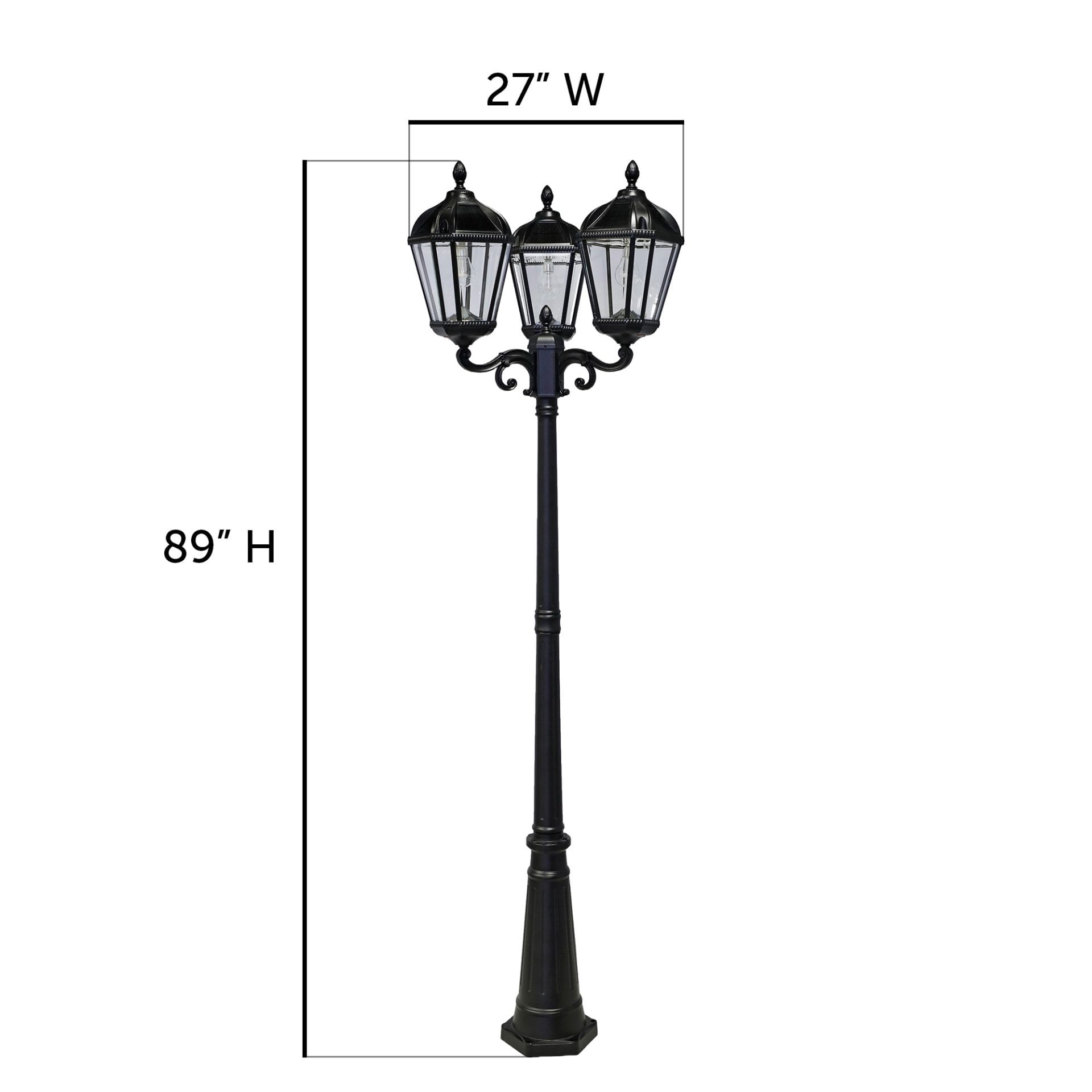 The Gama Sonic Royal Bulb is a traditional-style triple-headed solar lamp post that is ideal for illuminating driveways, front yards, gardens, pathways, patios, or any outdoor space while adding a refined touch to your outdoor decor. Available in weathered bronze and black, this lamp post enhances your space with a timeless design. Installation takes minutes. No wiring is needed, simply place this solar light in a spot with ample direct sunshine and let the sun do the rest. Standing 89 inches tall, at dusk, the solar lamps automatically turn on and provide a brightness of 450 lumens (150 lumens per lamp head) in a warm white (2700K) color temperature for up to 2 nights on a full charge.