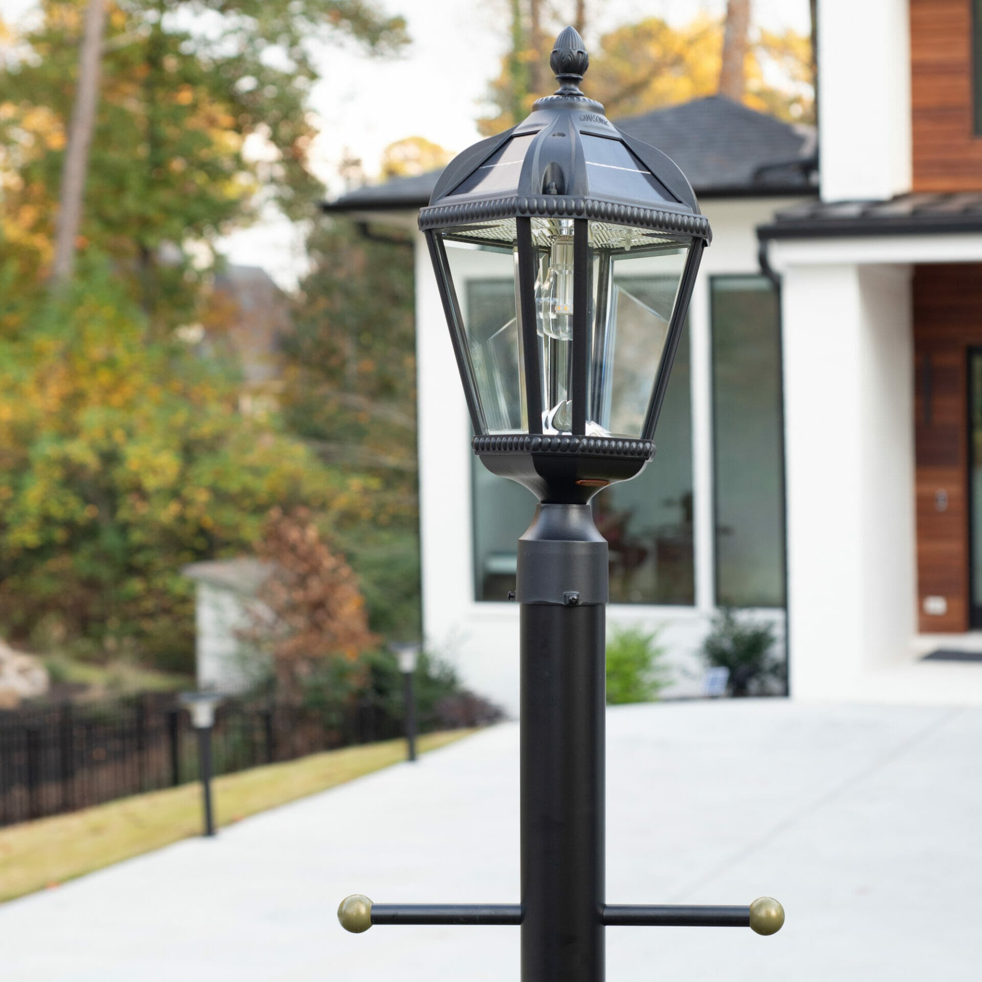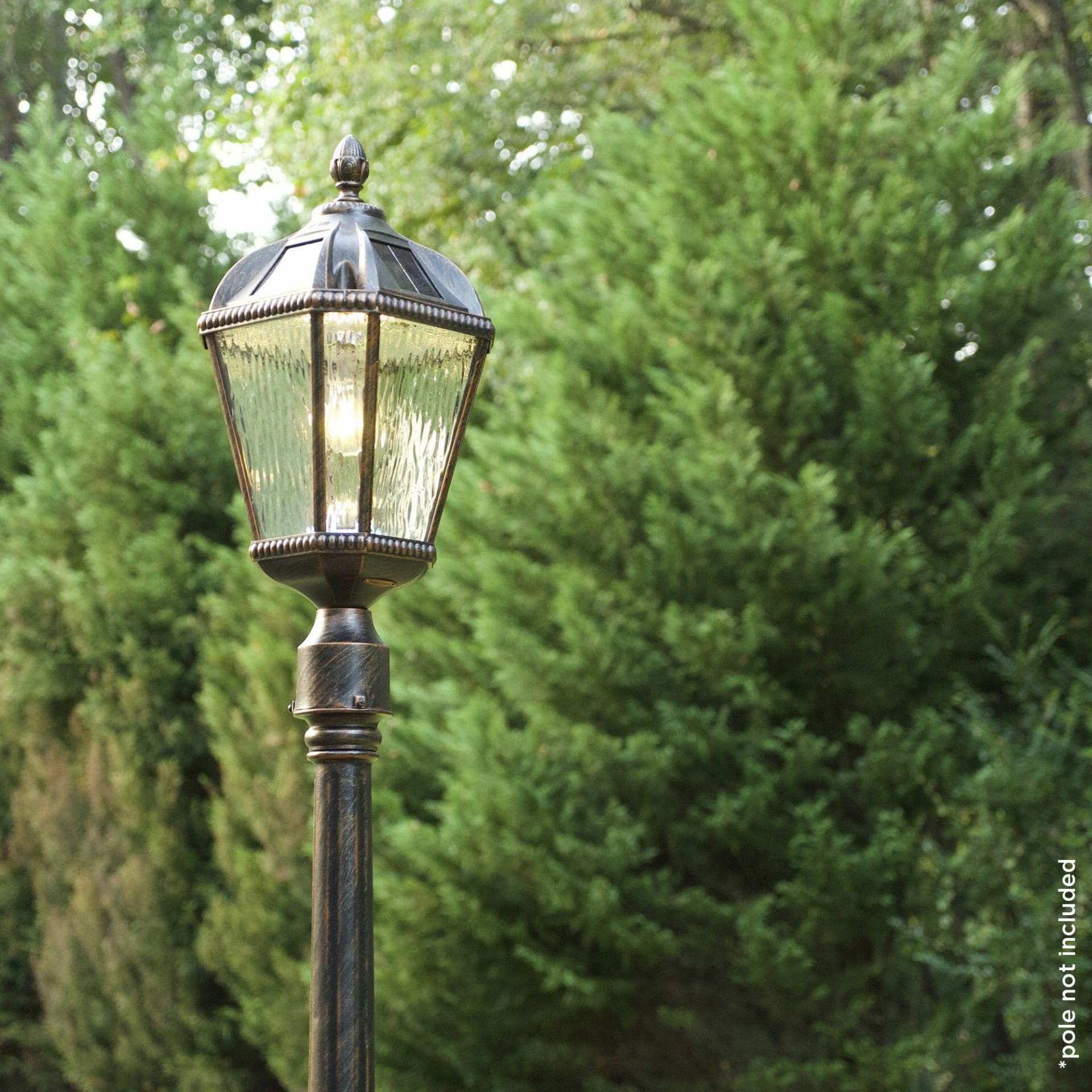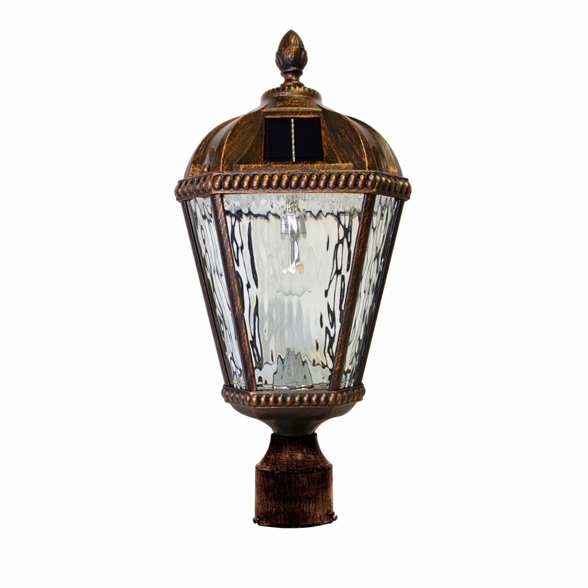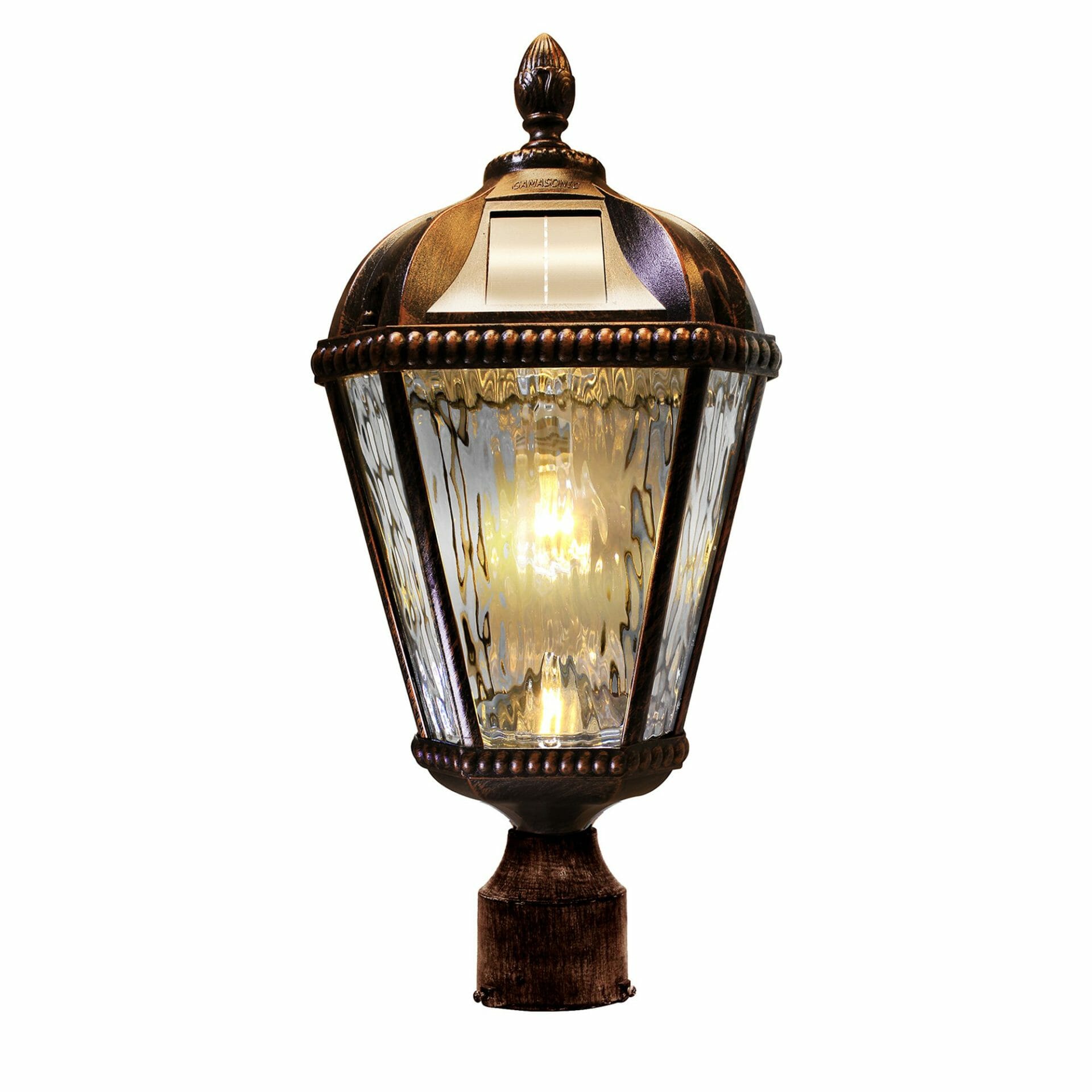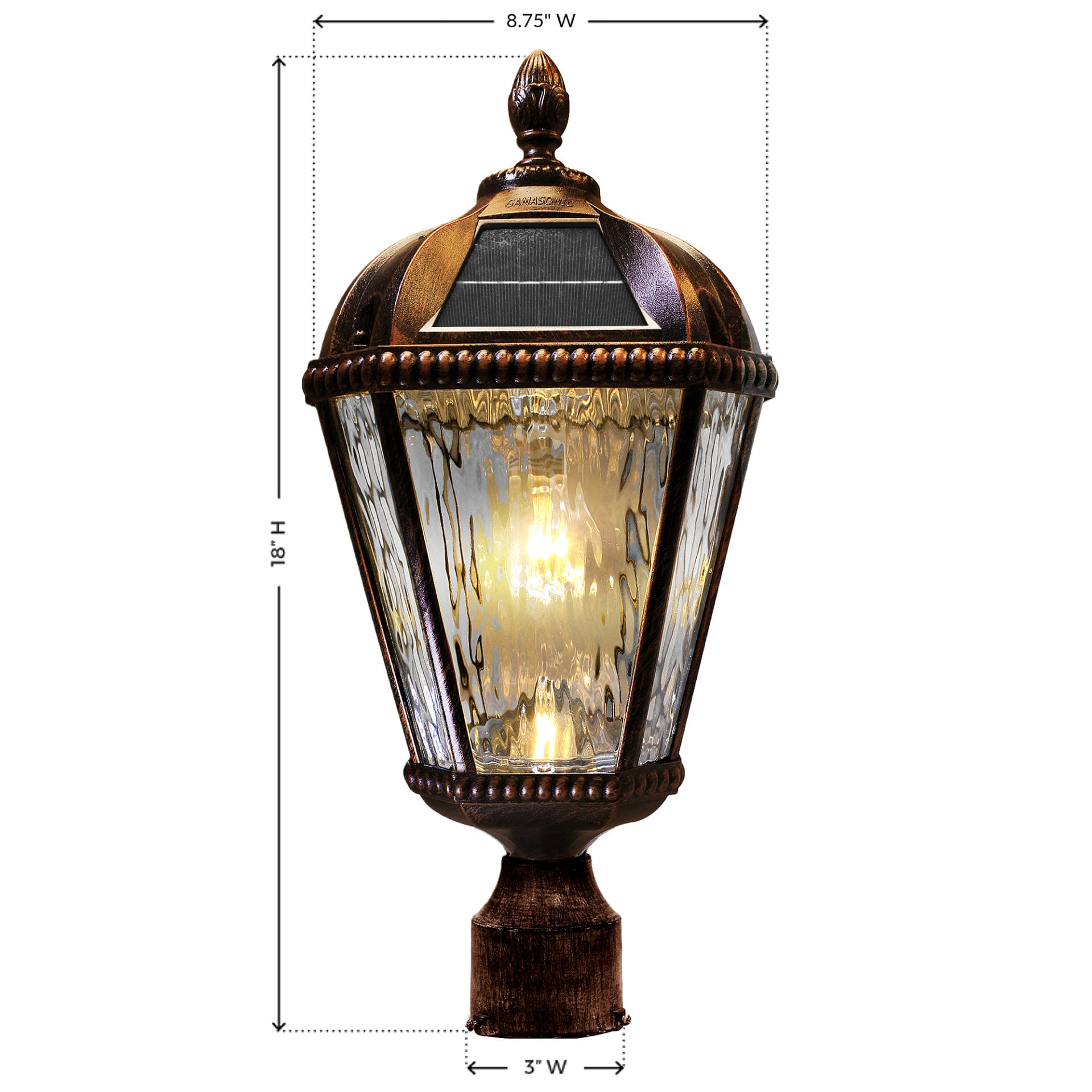 The Gama Sonic Royal Bulb is a single lamp head that features an attractive design inspired by New Orleans architecture. This solar post light comes with all necessary hardware for mounting and can be placed on any 3-inch outside diameter pole or 3-inch pier/ flat base. Stylish and easy to install, this light is the perfect solar lighting solution for your outdoor space. The Royal Bulb is constructed of weather-resistant, rust-resistant powder-coated black cast aluminum and beveled glass panes. This series incorporates our cutting-edge GS Solar LED Light Bulb technology and provides 360-degree illumination. At dusk, the solar lamp provides a brightness of 150 lumens in a warm white (2700K) color temperature for up to 2 nights on a full charge. No wiring is needed. Just place this solar light in a spot with ample direct sunshine and let the sun do the rest. This fixture is available both in black and weathered bronze color options.