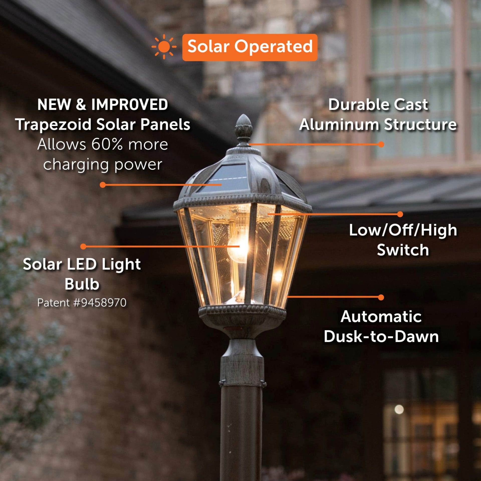 New and improved, now with 60% more charging power. The Gama Sonic Royal Bulb is a single lamp head that features an attractive design inspired by New Orleans architecture.