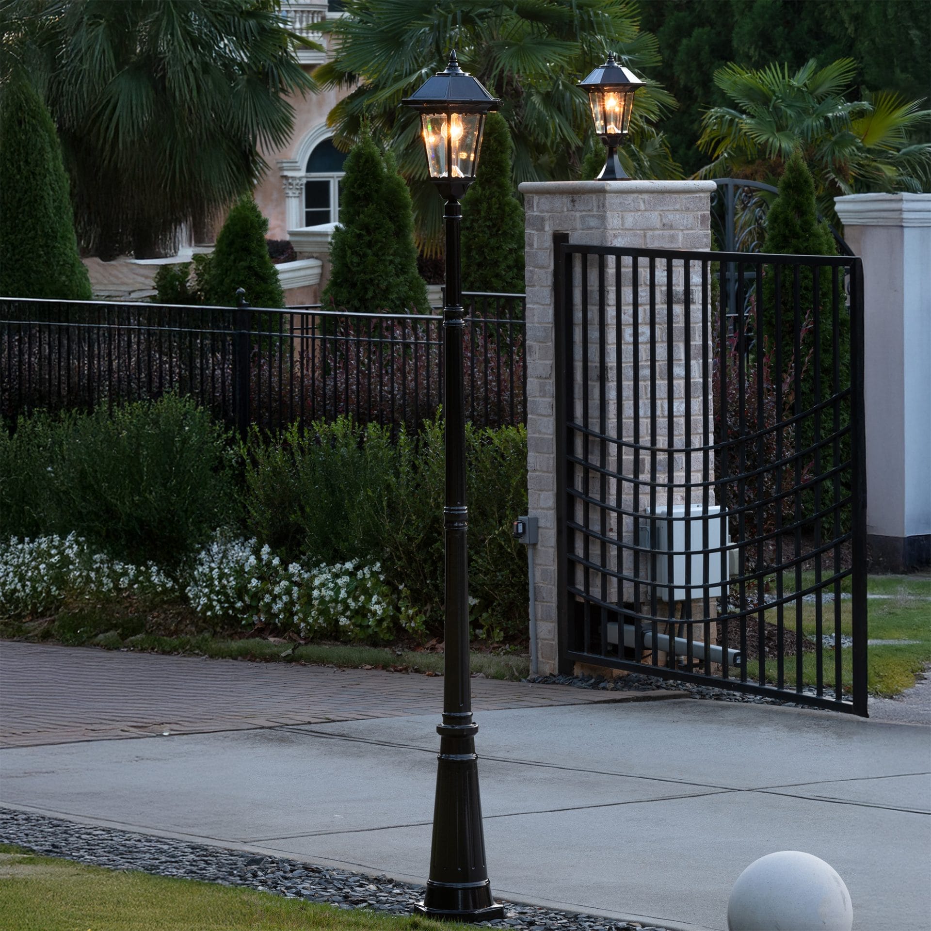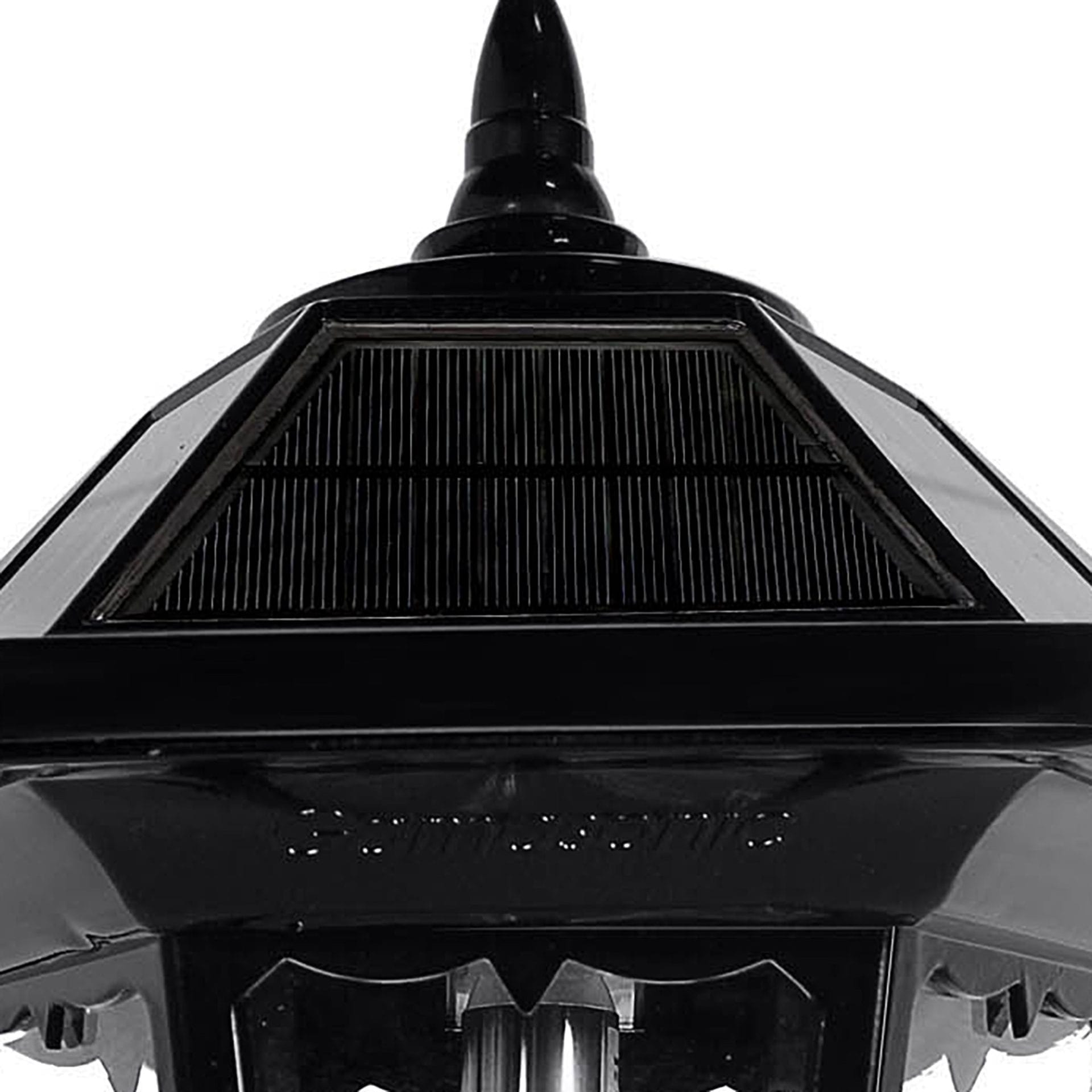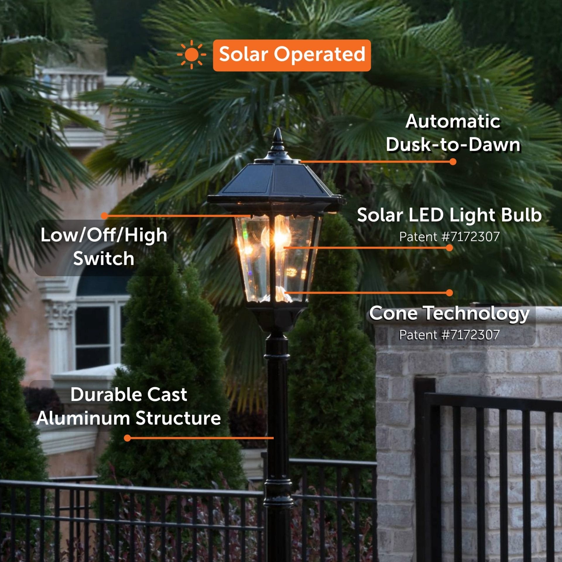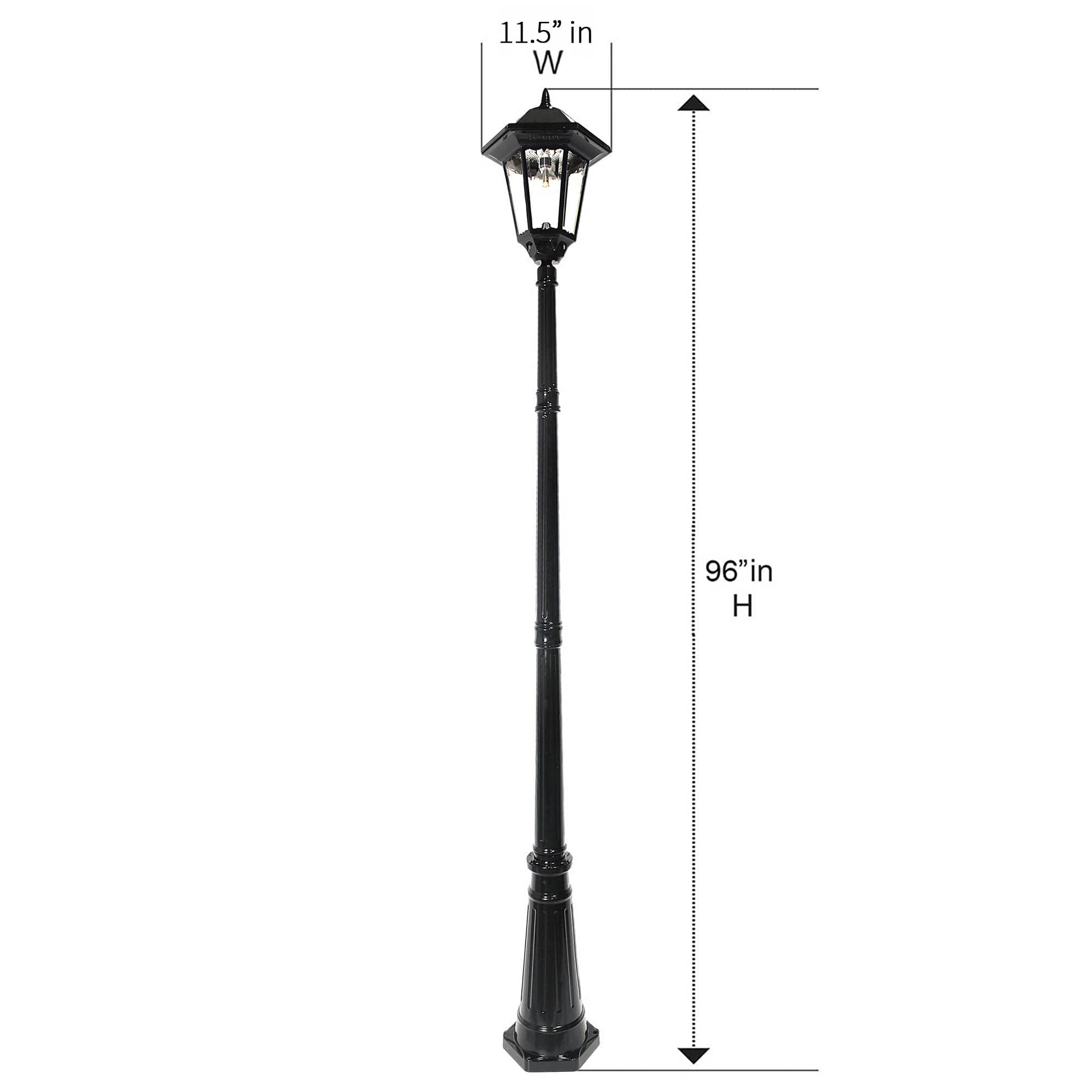 The Gama Sonic Windsor Bulb Solar Lamp Post is a stunning single-head solar light that brings a touch of elegance to any outdoor space. Standing 96 inches tall, this traditional solar lamp-post design adds charm and sophistication to your landscape, patio, or entryway. This decorative solar lamp combines elegance and functionality with its durable weather-resistant, rust-resistant black cast aluminum frame, ensuring durability for tough weather conditions through all seasons. The new and improved classic black solar post light is equipped with Gama Sonic’s advanced Morph Solar Panel Technology, meaning larger, integrated solar panels that capture more sunlight for increased efficiency, brightness, and longer runtime.
