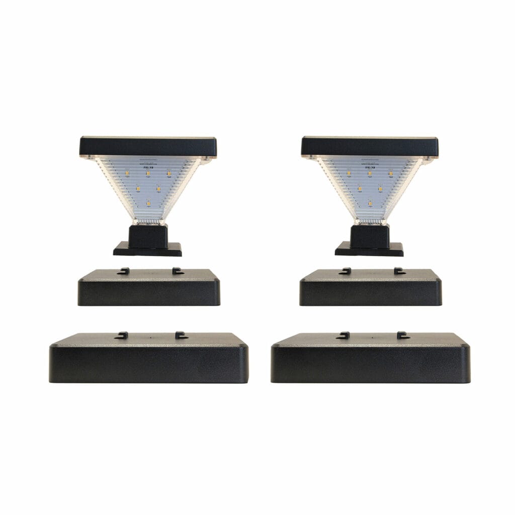 The Luxor Solar Post Cap Light is designed with an inverted pyramid shape that casts 50 lumens of warm white light. Perfect for deck railings or vinyl fencing, it includes both 4″ and 5″ cap bases for a secure fit on flat surfaces or standard posts.