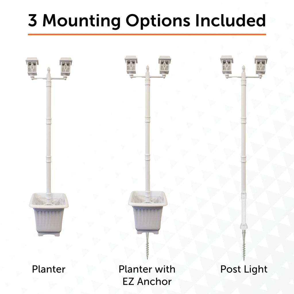 Add charm and personality to your outdoor space with the Luna II Double Solar Post Light with Planter & EZ Anchor, a decorative fixture that features 2 solar lamp heads with a planter base so you can showcase your favorite flowers or greenery while enjoying bright, solar-powered illumination. With three mounting options, use it freestanding on a flat surface, secure it with the EZ Anchor for in-ground use, or convert it to a traditional post light. It’s a flexible, all-in-one accent for patios, decks, or porches.