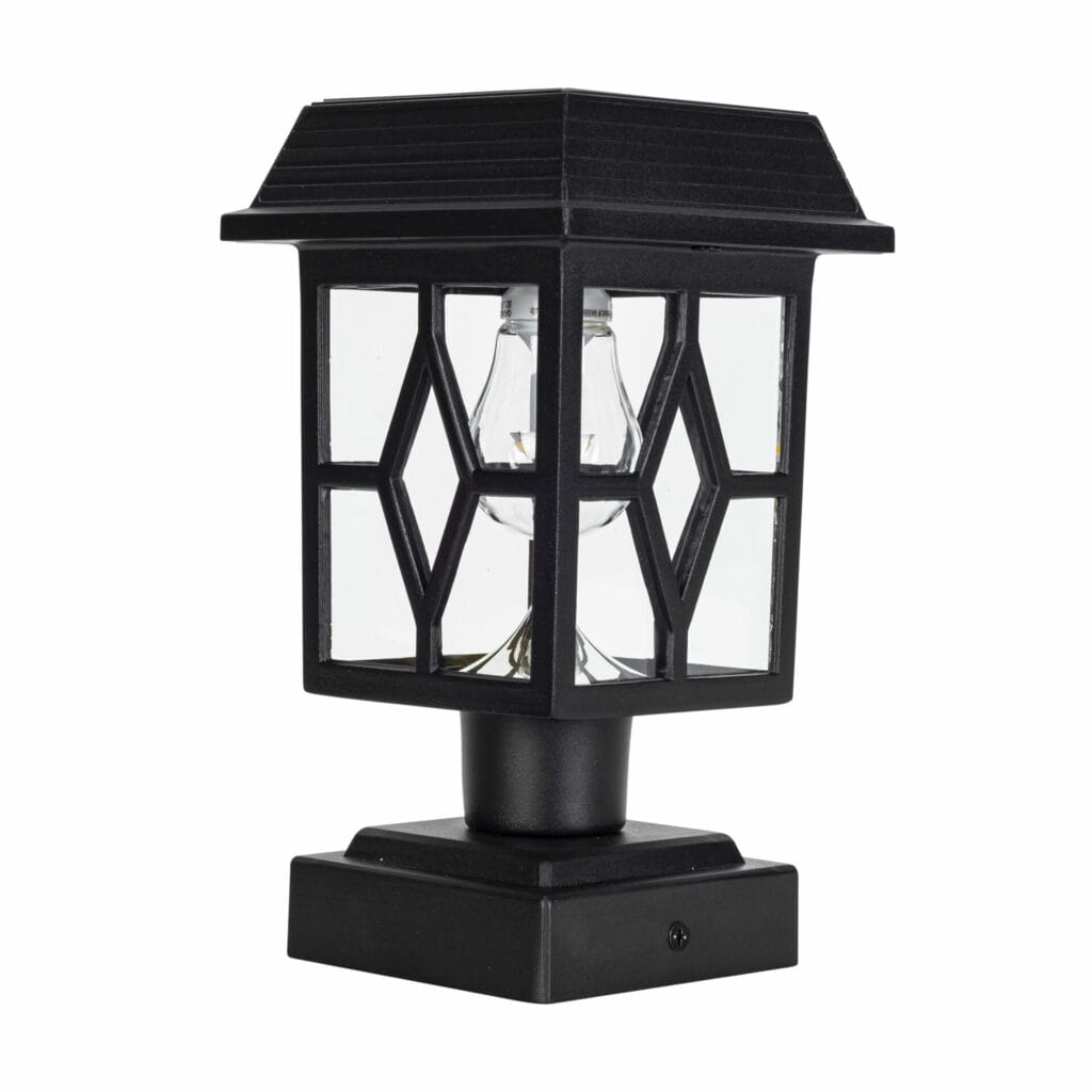 Add subtle accent lighting to your outdoor posts or flat pillars with the Luna II Solar Post Cap and Pier Mount Light, designed to fit standard 4″x4″ posts or rest securely on flat surfaces. Featuring a black frame with decorative windowpane detailing and a warm glow at 50 lumens, this fixture brings soft charm and elegance to patios, railings, or entryways.