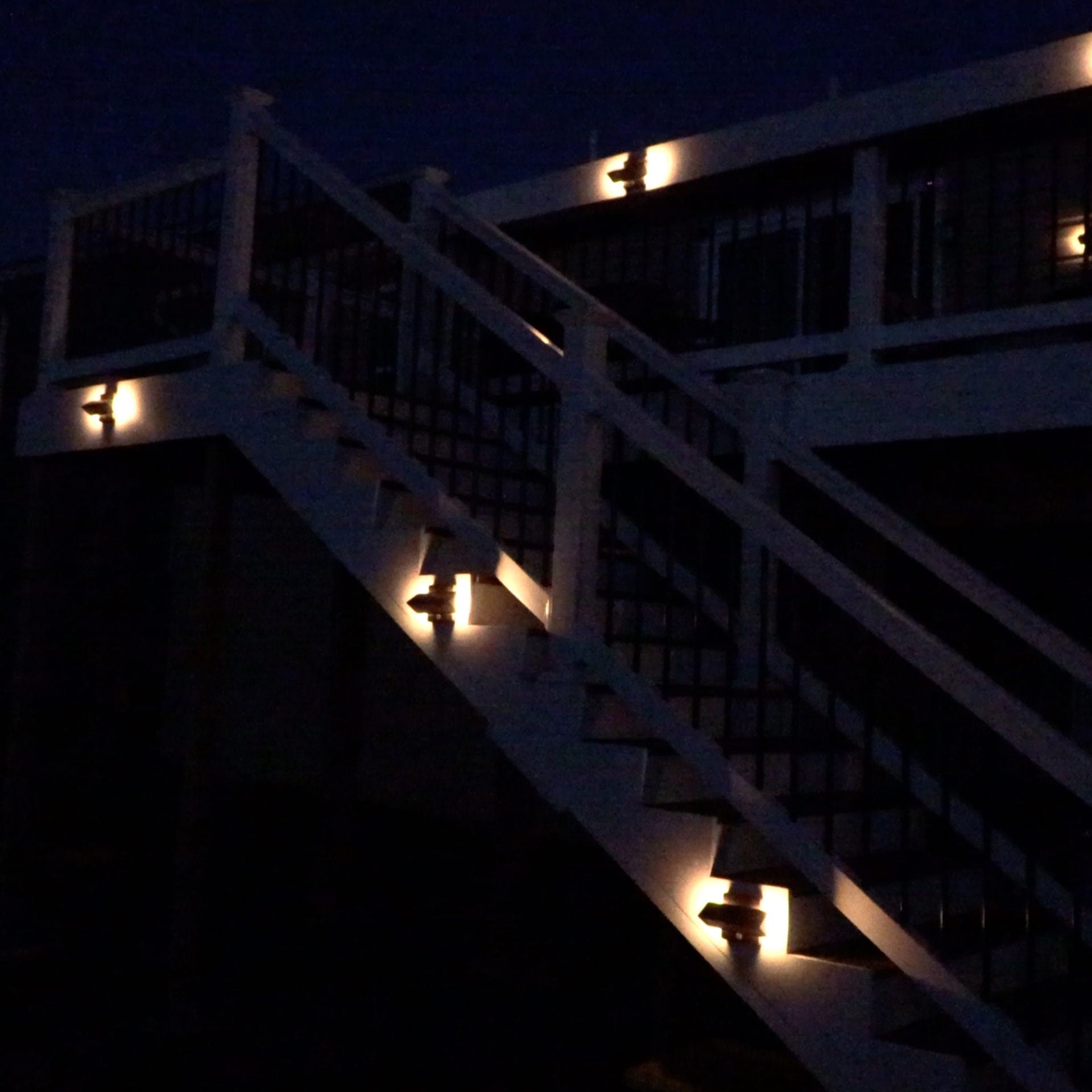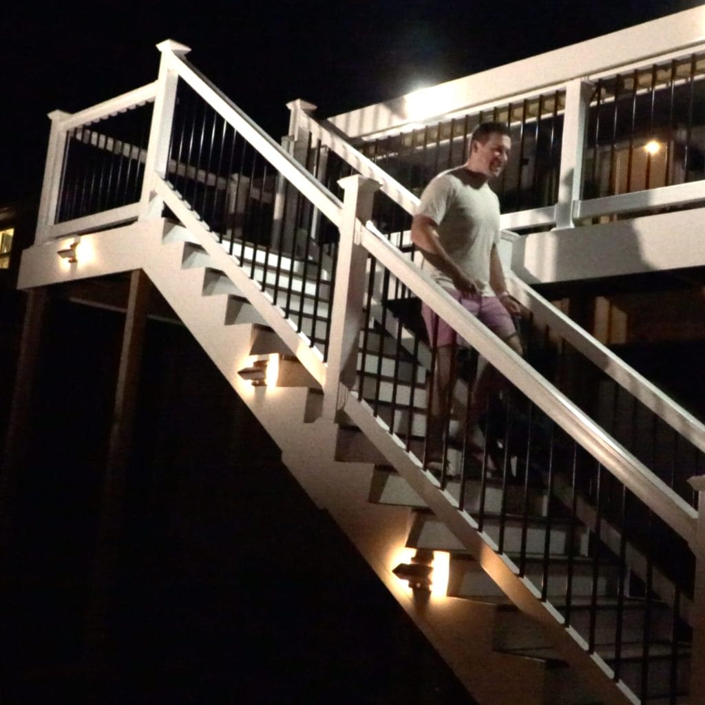 Its smart design features two lighting zones: the soft warm white back lights stay on throughout the night, while front LEDs activate when motion is detected, offering added visibility just when you need it. Made from durable cast aluminum and available in bronze or black finishes, it’s a modern solution for both safety and style on your deck or patio.
