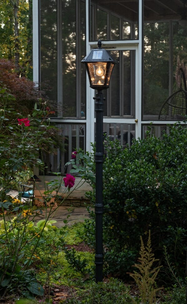 The Gama Sonic Baytown II Bulb is a single solar lamp post with an EZ Anchor mounting system that features a traditional design that resembles a 19th-century lantern.