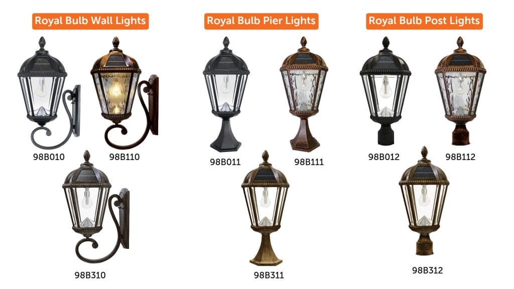 The Royal Bulb Solar Light is available in a Wall Mount, Pier Mount, and 3” Fitter Mount, providing versatile placement options while maintaining the traditional elegance that complements any home exterior.
